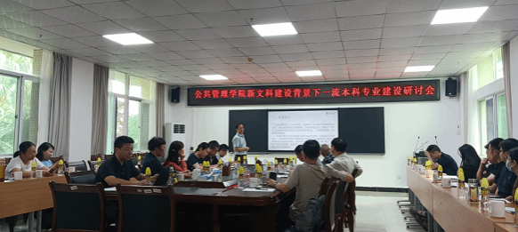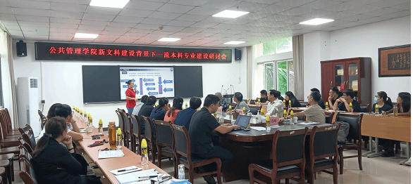 ;; ;;2023年11月2日上午,公共管理学院在社科楼219会议室召开了新文科建设背景下一流本科专业建设研讨会。会议由本科教学副院长陈丽琴教授主持,会议邀请了北京大学周志忍教授、对外经济贸易大学彭向刚教授、华中科技大学公共管理学院徐晓林教授和电子政务建模仿真国家工程实验室江源富主任对我院新文科研究与改革实践项目和一流本科专业建设做指导。参加会议的有学院全体领导、责任教授、系主任及专业教师。