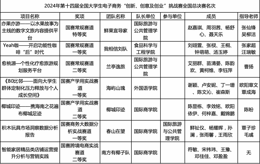 日前,第十四届全国大学生电子商务“创新、创意及创业”挑战赛全国总决赛(“三创赛”)圆满收官,本届赛事吸引了全国31个省、市(自治区)的近18万支团队报名参加,最终有232支团队入围常规赛道总决赛、82支团队入围跨境电商实战赛、120支团队入围产教融合实战赛、121支团队入围乡村振兴实战赛。402永利集团官网入口代表海南省遴选入围全国总决赛的7支团队全部荣获国家级奖项,分别荣获常规赛全国总决赛特等奖1项、一等奖1项、二等奖1项,商务大数据分析实战赛全国总决赛一等奖1项,产学用(BUC)实战赛全国总决赛一等奖1项、二等奖1项,跨境电商实战赛全国总决赛二等奖1项。获奖总数和最好名次均创造了我校参加此项比赛以来的最好成绩。