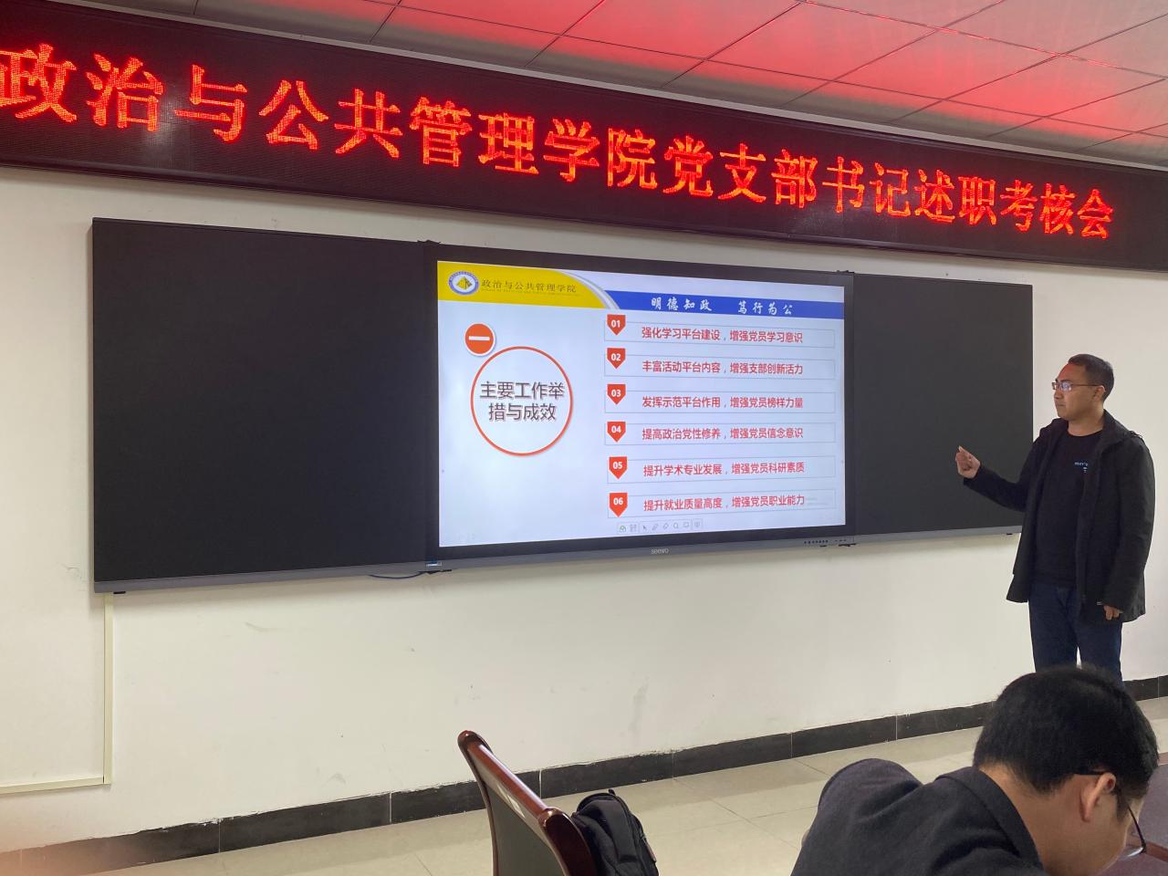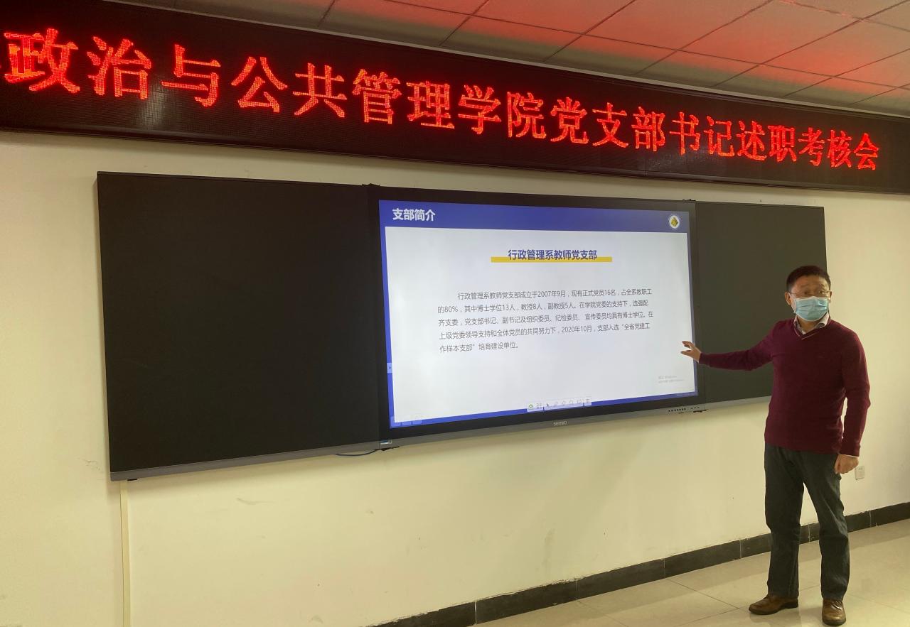 2020年12月29日下午,政管学院党委于社科楼A216召开党支部书记述职考核会,学院党委书记王默忠,副院长刘德浩,党委委员江红义,特邀组织员曹玲娟出席会议,各党支部书记以及教师党员代表参加本次会议。会议由党委书记王默忠主持。