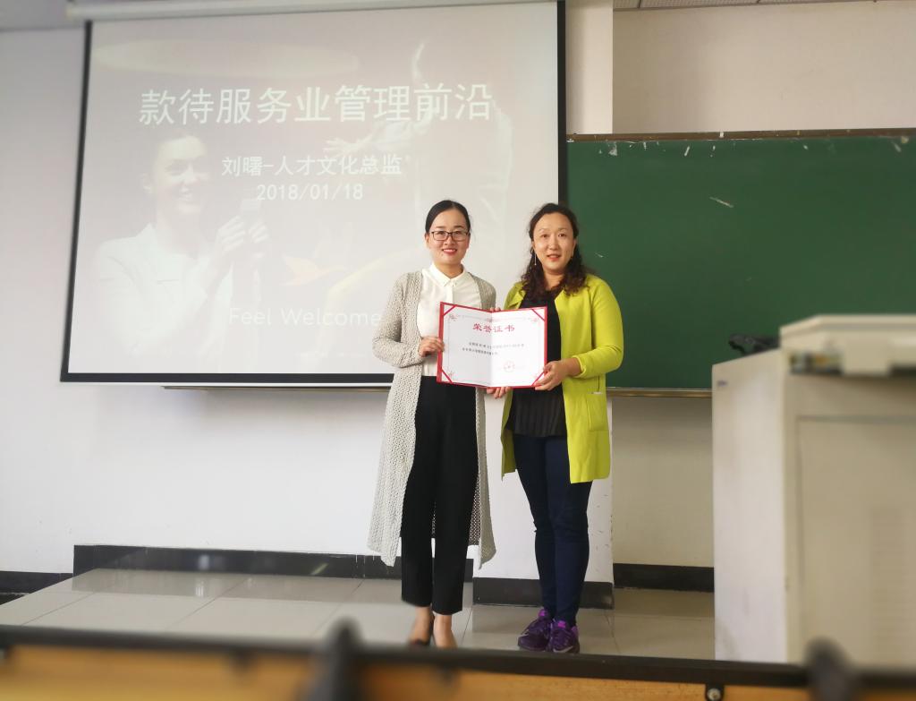2018年1月18日下午,雅高酒店集团三亚湾海居铂尔曼度假酒店人才与文化总监刘曙女士应邀为402永利集团官网入口16级酒店管理专业学生教授冬季小学期授课,讲座围绕款待服务业管理前沿相关知识展开。本次讲座由酒店管理系主任杜肖寒老师主持,并向刘曙女士颁发“冬季小学期校外专家”聘书。