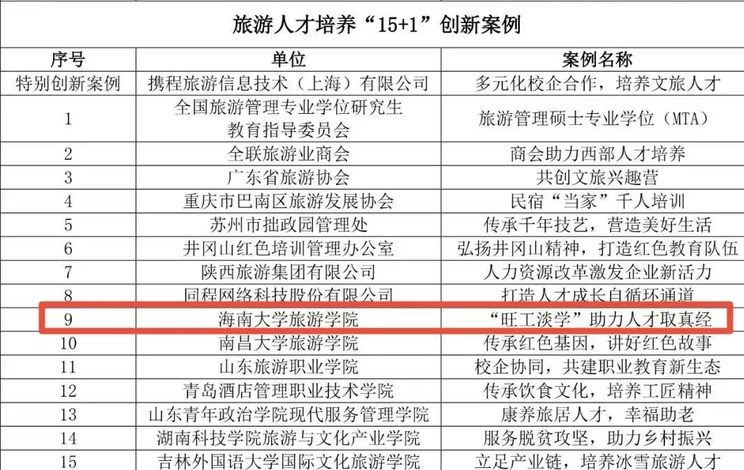 “旺工淡学”旅游人才培养项目在我省已实施两年,取得了良好的成效,在推动自贸港旅游业高质量发展中发挥了显著作用,得到了各级政府部门的高度认可和鼓励。一是项目被列为海南自由贸易港制度创新案例于2020年4月25日对外发布,得到相关部委的认可并在全国复制推广。项目的相关工作成果还获得由海南省人民政府组织的2021年第二届海南省改革和制度创新奖三等奖、海南省社科联组织的2021年海南自贸港研究优秀成果奖三等奖。