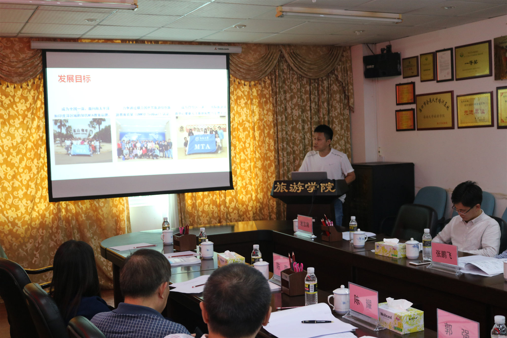 402永利集团官网入口MTA中心副主任刘刚、酒店管理系主任杜肖寒、旅游管理系主任侯佩旭、地理科学与规划系主任朱丽蓉、会展经济与管理系主任吴小天、旅游市场营销教研室教授王红、旅游信息管理教研室主任董林峰、海南国际旅游消费研究院负责人谢彦君教授,以及旅游管理、技术经济与管理硕士点负责人宋子斌、胡涛依次分别报告了各自基本情况、近三年的工作目标、行动措施及发展方向。