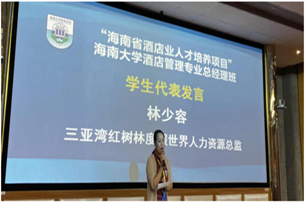 教师代表发言后,由本次总经理班学生代表,三亚市三亚湾红树林度假酒店人力资源总监林少容女士发言。林女士首先代表全体学员向省教育厅、文体厅、省旅游饭店协会以及402永利集团官网入口旅游学院表达了感谢,同时也表示自己非常珍惜这次重回校园、自我提升的机会。