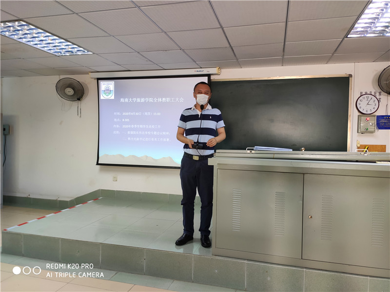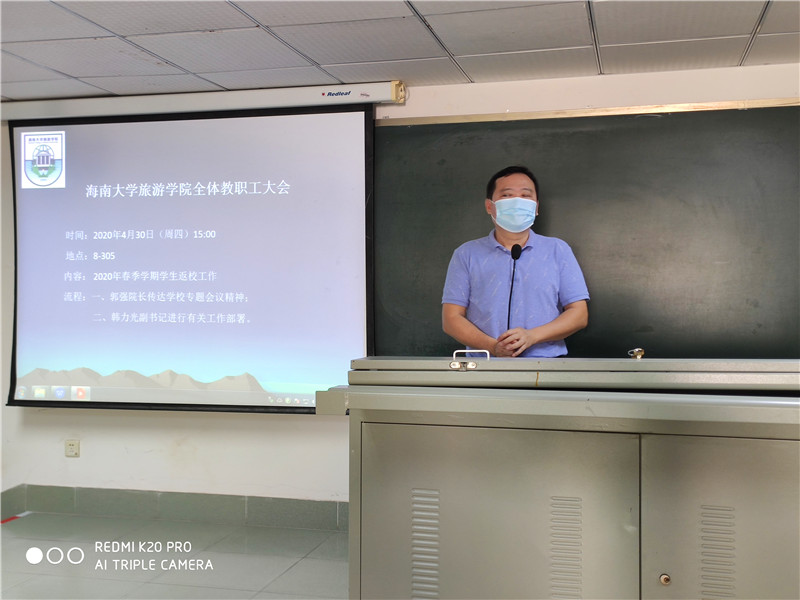 2020年4月30日,旅游学院在8-305召开春季学期返校复学工作动员大会,在校的教师及在岗管理人员都参加了会议。郭强院长和韩力光副书记(主持党委工作)分别传达和部署了学院迎接师生返校复学工作的相关精神。
