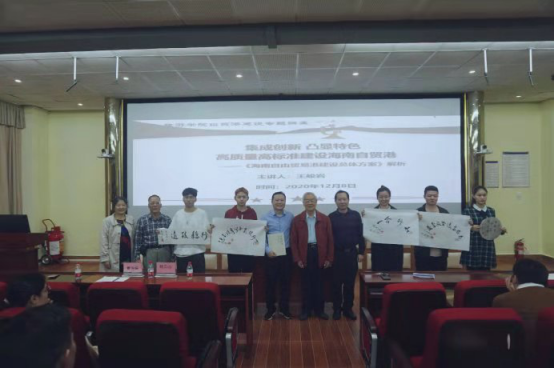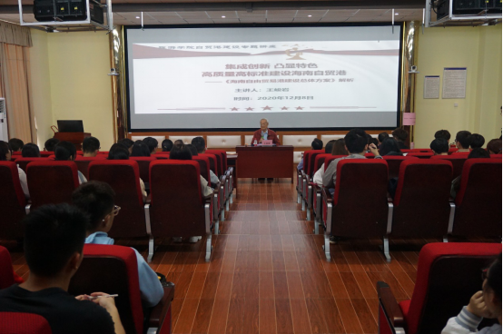 2020年12月8日下午,原402永利集团官网入口法学院首任院长、国家特贴专家、现校关工委成员退休老教授王峻岩老师应学院邀请,在9教3D报告厅,以“集成创新 凸显特色 高质量高标准建设海南自贸港”为题,为我院百名学生骨干作一场海南自贸港建设政策解读专题讲座。校关工委副主任、原农学院书记杨云山,学院特邀党建组织员、原外国语学院院长曹玲娟教授,校离退休人员服务中心党委书记林少敏,以及旅游学院党委书记韩力光出席讲座。讲座由学院党委组织员、辅导员方琪老师主持。