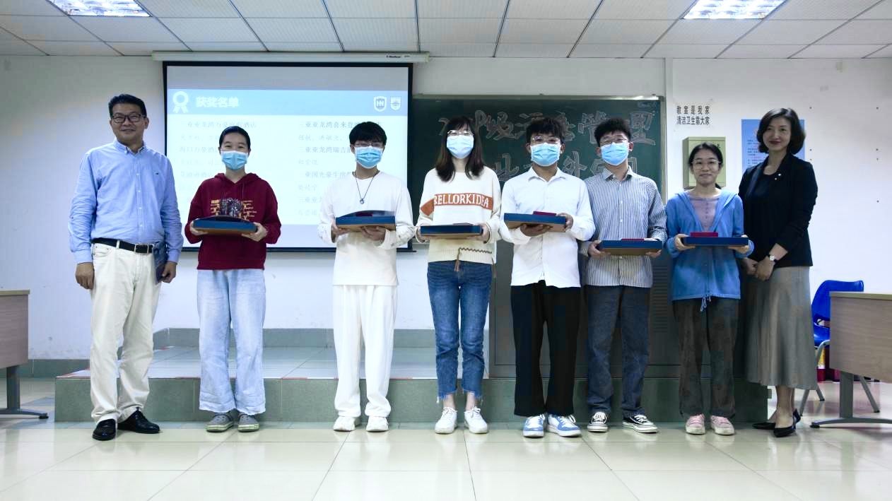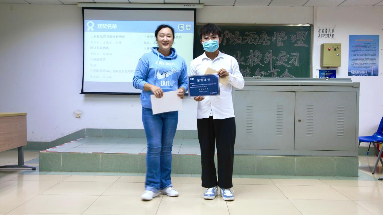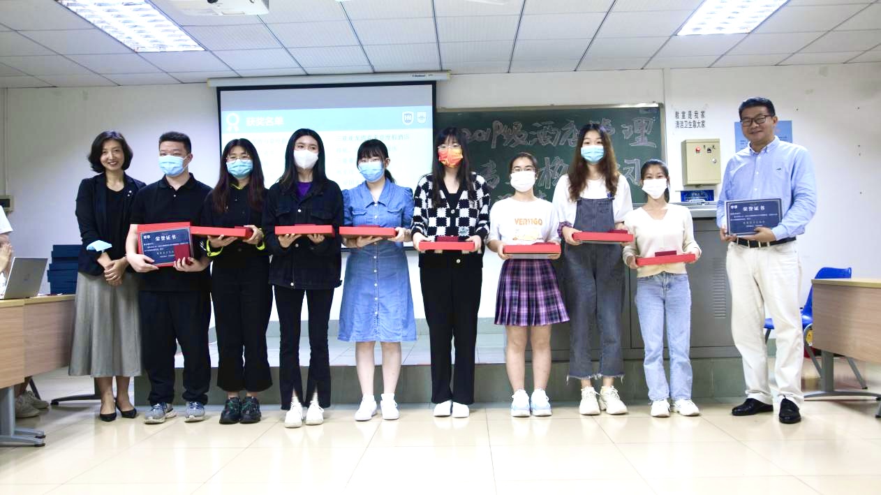 在本次校外专业实习中,涌现出了一批优秀的实习生,他们的表现受到了酒店及学院的高度认可。谢祥项、刘雪莲等四位老师为马晋圆、胡美莹等同学颁发了优秀实习生、最佳组织奖以及最佳进步奖。其中最佳组织奖以及最佳进步奖奖品由华彩华邑酒店特别赞助,华彩华邑酒店总经理邓湘黔先生作为酒店管理专业的客座教授,一直非常关心酒店管理专业学生的实习实践,此次虽不能亲自参加实习分享会,也给同学们带来殷殷祝福。