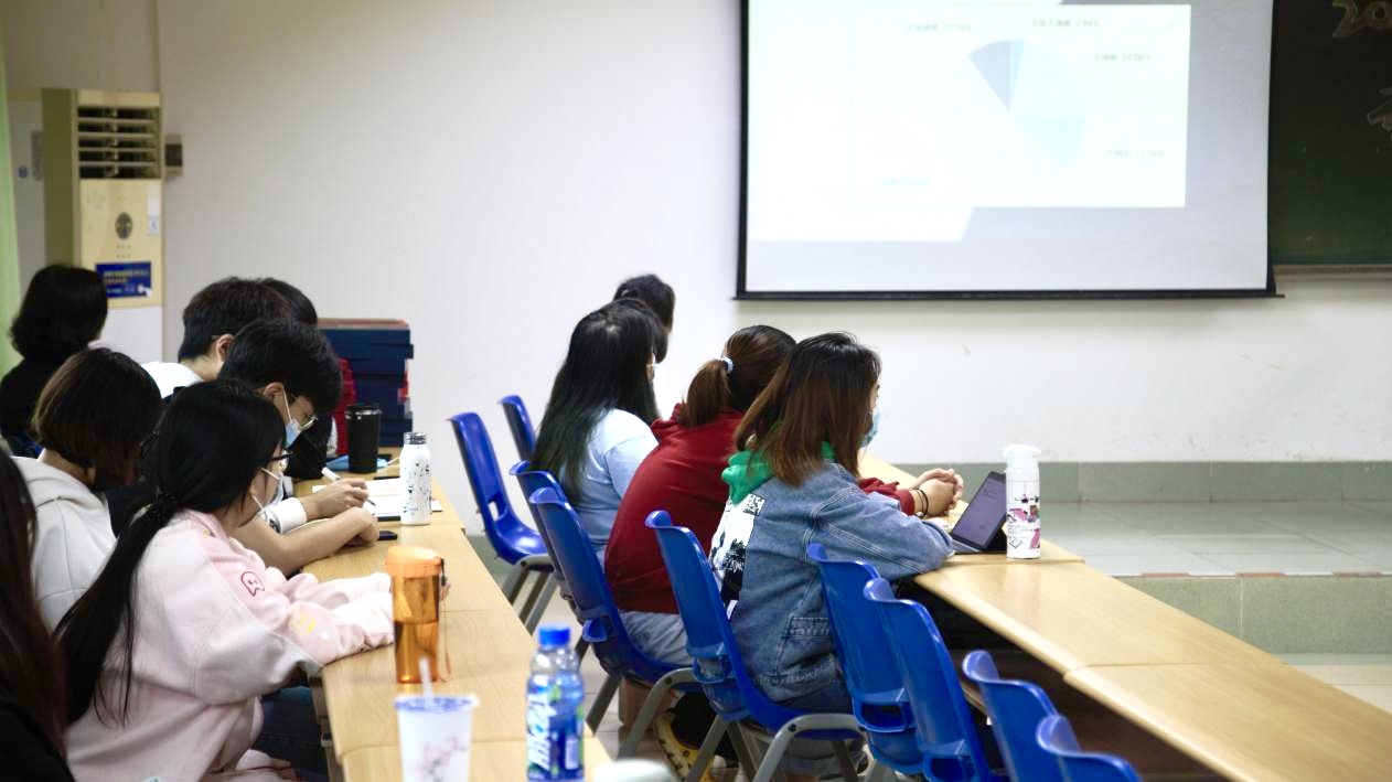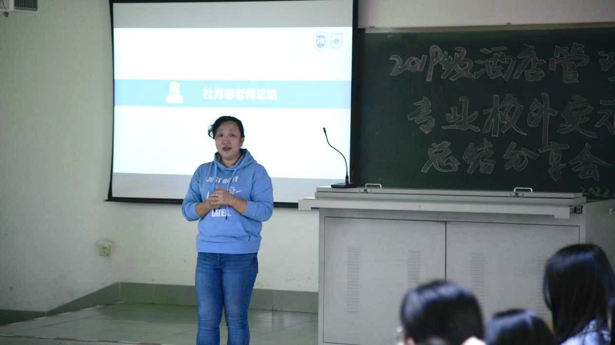 老师总结结束后,由马晋圆同学对此次2019级酒店管理专业的实习情况进行汇报。马晋圆同学依托前期问卷调查数据,从同学们对本次实习的满意度、对实习酒店管理水平的反馈、实习期间心理状态、未来的职业规划等多个方面进行了详细的分析和汇报,并总结传达了同学们对本次专业实习的意见和建议。通过本次实习,同学们都发现了自己的不足和理论联系实际的欠缺,未来会继续深入学习,确立自己的职业规划目标,在今后的实习生活中不断提升自我,达到新的高度。