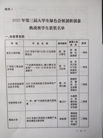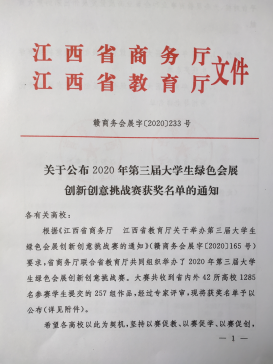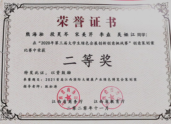 日前,由江西省教育厅、江西省商务厅主办的“第三届大学生绿色会展创新创意挑战赛”在南昌隆重举行。由我院耿松涛教授带队指导,2018级会展经济与管理专业熊海凇、段昊岑、宋美芹、吴娅江、李垚五名同学组成的402永利集团官网入口旅游学院代表队以总成绩第五名,荣获比赛二等奖。