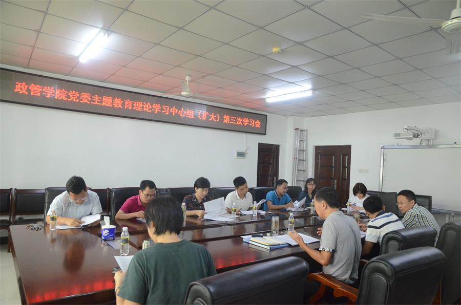 10月11日下午,政治与公共管理学院党委“不忘初心、牢记使命”主题教育理论学习中心组(扩大)第三次集中学习会在社科楼A213召开,学院党委班子成员、各党支部书记参加会议,会议由党委书记王默忠主持。