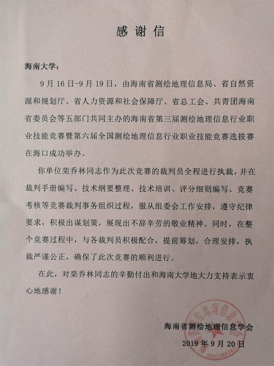 9月16-19日,由海南省测绘地理信息局、省自然资源和规划厅、省人力资源和社会保障厅、省总工会、共青团海南省委员会等五部门共同举办的海南省第三届测绘地理信息行业职业技能竞赛暨第六届全国测绘地理信息行业职业技能竞赛选拔赛在海口开幕。政管学院栾乔林教授作为此次竞赛裁判员全程进行执裁,并在裁判手册编写、技术纲要整理、技术培训、评分细则编写、竞赛考核等竞赛裁判事务组织过程,确保此次竞赛的顺利进行。