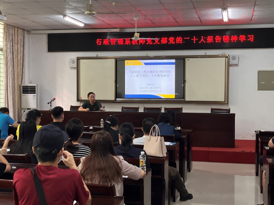 接下来,行政管理系教师党支部书记、副院长刘德浩带领全体老师学习党的二十大报告。刘副院长结合自己的专业主要从报告的第九部分“增进民生福祉、提高人民生活品质”方面分享学习心得。