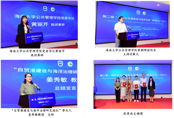 闭幕式由402永利集团官网入口公共管理学院副院长黄朝明教授主持,402永利集团官网入口公共管理学院党委书记黄丽芹代表主办单位向线上线下出席论坛的所有嘉宾表示感谢和敬意。“自贸港建设与海洋治理”研究团队带头人姜秀敏教授做了总结发言,总结本届论坛呈现的三大亮点:一是朋友圈广,蓝色学术共同体不断壮大;二是议题前沿,紧扣国家最新的海洋事业发展时代需求;三是交叉创新点多,激发出许多创新点和思想火花。最后,为评选出来的优秀论文获奖者代表颁奖。