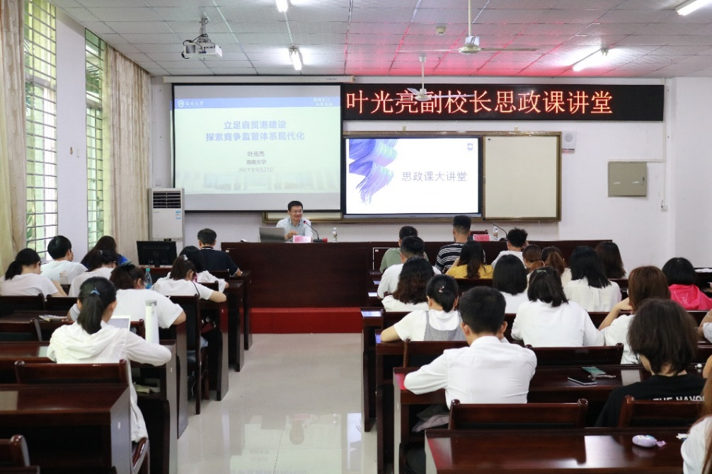 叶光亮教授以“立足自贸港建设,探索竞争监管体系现代化”为题,详细阐述了海南自由贸易港建设的现状和前景。他首先为大家介绍了自贸港“6+1+4”的制度设计,充分展示了海南作为高水平开放窗口的制度优惠与突破。接着,叶光亮教授为大家讲解了竞争政策的历史与发展现状,以生动可感的案例引导同学们理解和思考竞争政策建立的必要性与重要性。他指出,高水平开放离不开基于竞争政策的高质量监管,建设基于人工智能和区块链的公平审查技术体系与平台将成为解决审查需要的良方。同时,叶光亮教授强调,公共管理类专业人才在自贸港政策建设中大有可为,并对我院学生寄予殷切希望,鼓励学生树立高远志向,热情投入自贸港建设的队伍,以跨学科的交叉视角为自贸港建设作出贡献。